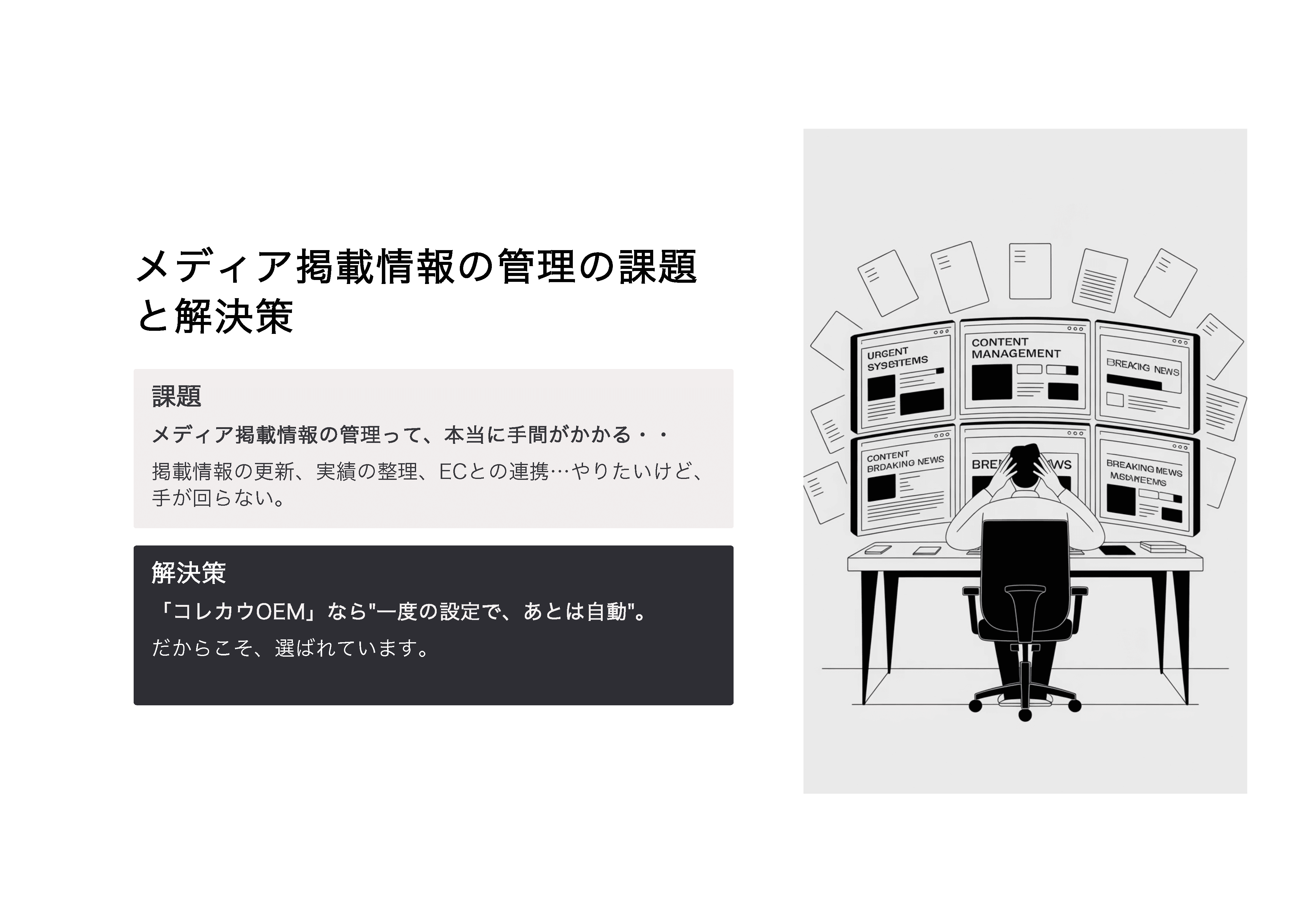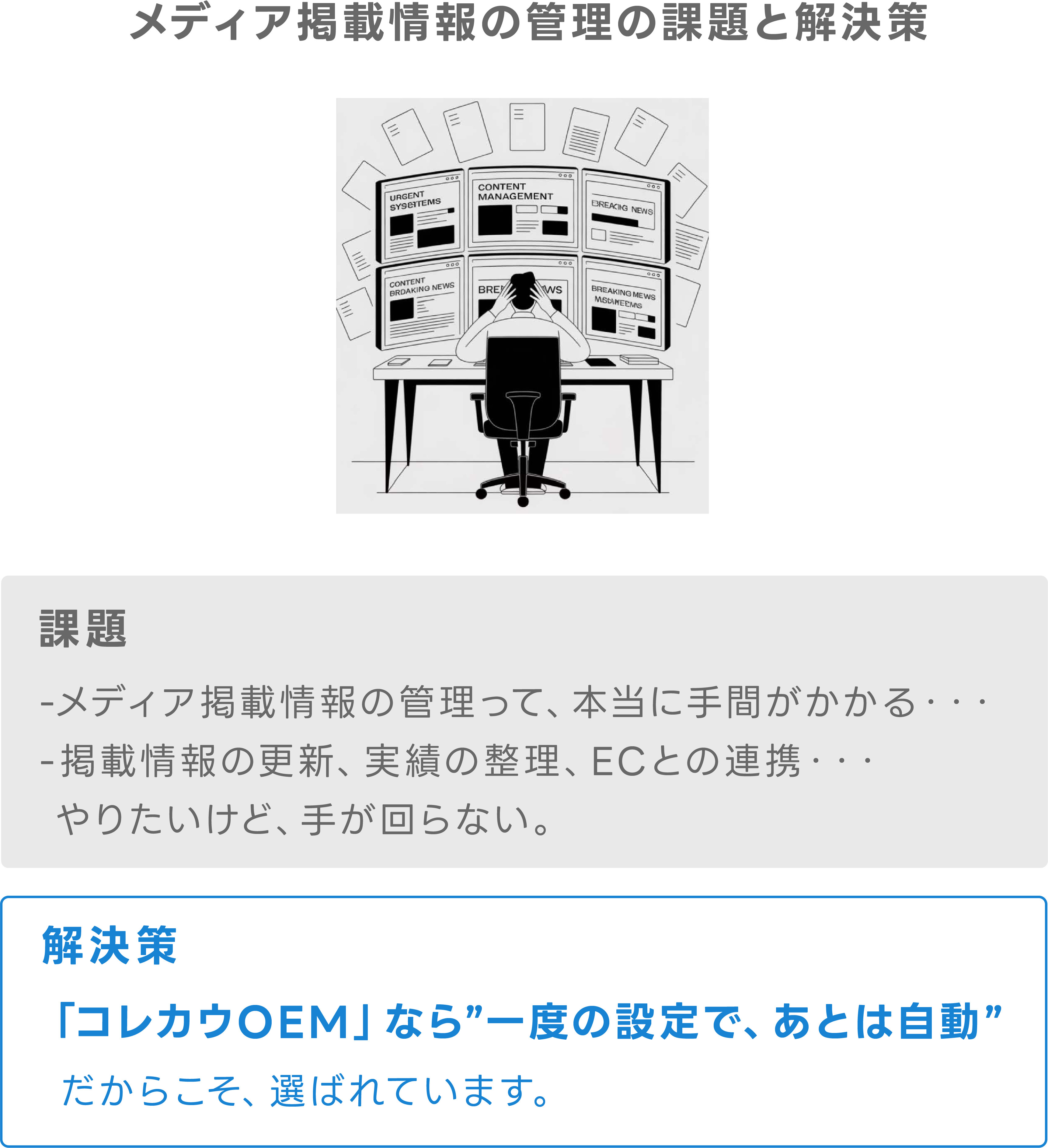 「コレカウOEM」は、ECサイト運営者様の手間を最小限に抑えながら、メディア掲載情報を最大限に活用できるサービスです。